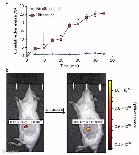 图3. 超声促进体内脂质体释放染料。图片来源:Nat. Biomed. Eng.
