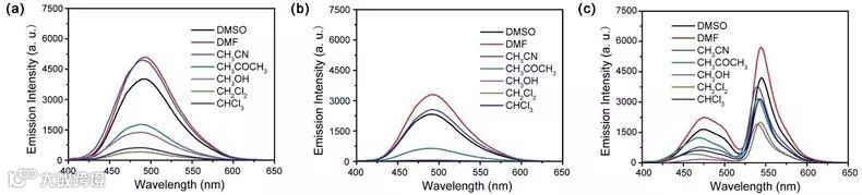 该工作通过具有聚集诱导发光效应(AIE)的四苯乙烯基四苯甲酸钠配体1、有机铂配体2以及双吡啶基配体3a-c的自组装,分别制备了三个发光性质不同的铂分子笼,并研究了溶剂对该类铂金属笼发光的影响。溶剂对于铂分子笼4a-c的荧光发射影响非常明显:一般说来,在极性非质子型溶剂如DMSO、DMF、CH3CN中,该类分子笼的荧光较强,量子产率较高,而在一些非极性非质子型溶剂和质子型极性溶剂中,其荧光较弱,量子产率也相应较低。另外,分子笼4c表现出两组荧光发射峰,分别对应于其结构中的四苯基乙烯基团和BODIPY基团的发射。