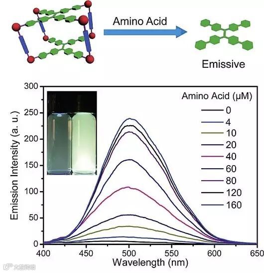 作者进一步拓展了该类分子笼在含巯基氨基酸的化学传感器方面的应用。他们选取分子笼4b作为研究对象,该分子笼在甲醇和水的混合体系中发光很弱。由于巯基与Pt(Ⅱ)离子具有更强的结合能力,会导致组装体解离,释放出发光很强的四苯甲酸四苯基乙烯配体。随后体系中再加入定量的Pt(Ⅱ)离子,该分子笼又会重新生成。因此,分子笼4b作为一种“turn on”的荧光化学传感器可用于含巯基氨基酸的检测。