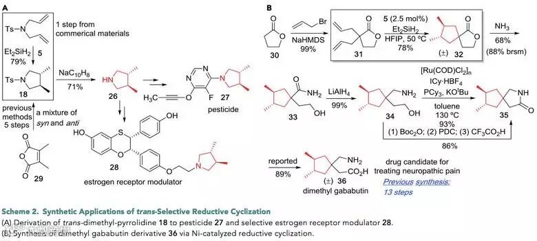 为了说明该方法学在有机合成中的应用价值,作者合成了两个具有生物活性的中间体。一是反式-3,4-二甲基吡咯烷,可以作为重要的杀菌剂27和雌激素受体调节剂28的合成前体。二是反式-3,4-二甲基gababutin消旋体,可以用作治疗神经性疼痛的药物先导化合物。他们首先利用γ-丁内酯作为前体合成α,α-二烯丙基-γ-丁内酯31,之后在标准反应条件以2 mmol的反应规模,78%的分离收率获得消旋的前体化合物32,最终经历开环、还原以及分子内脱水酰胺化获得专利报道(Patent WO2004099160)的中间体35。相比于以往十三步的合成方法,作者通过六步并以42%的总收率完成了该消旋体的合成。