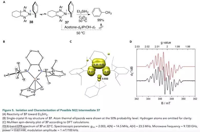 为了解释反应的还原化学选择性和专一反式非对映选择性,作者对反应的机理进行了研究。该反应的速率与底物以及催化剂的浓度无关。当对催化剂的休眠态进行捕捉时,1H NMR呈现出顺磁信号的谱图。EPR谱显示,无论使用[(α-diimine)Ni(I)(μ-Br)]2(5)还是(Bnα-diimine)Ni(II)Br2 (7)作为催化剂,反应的休眠态都是Ni自由基。在六氟异丙醇作为溶剂的条件下,反应中伴随着Et2SiH(OCH(CF3)2)副产物的缓慢形成。相应的,反应在异丙醇中进行时得到了Et2SiH(OPr)副产物。通过进一步的研究,作者合成了可能的反应中间体(α-diimine)Ni(I)Bn络合物37。ORCA package计算和室温下的EPR表征显示了该络合物的单电子主要离域稳定在配体上,形成Ni(II)络合物38。