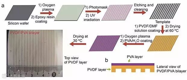 最近,华东师范大学化学院的张利东课题组(第一通讯作者单位)与中国科学院深圳先进技术研究院的杜学敏课题组(第二通讯作者单位)合作,以聚偏氟乙烯(PVDF)和聚乙烯醇(PVA)高分子材料为研究对象,利用模板技术将微孔道仿生结构复制到PVDF膜表面,使得制备的PVDF/PVA双层薄膜在结构上具有周期变化的机械张量,当受外界刺激时,可实现对双层膜形变的调控。