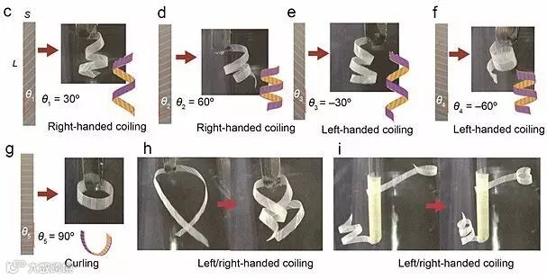 薄膜在丙酮的蒸汽氛围中,会“不知疲倦”地翩然起舞。这是因为溶剂分子在薄膜中实现了差异化溶胀,进而驱动薄膜发生复杂的形变运动。更为重要的是,该智能薄膜经过溶剂氛围数天的反复刺激,仍然保持着优异的机械性能。薄膜可通过不同的结构设计实现可控的定向运动。当PVDF膜表面的微孔道排列和薄膜的长轴夹角保持在30°或60°时,薄膜受到丙酮分子的刺激将产生右手性的缠绕运动。反之,微孔道排列和薄膜的长轴夹角保持在-30°或-60°时,薄膜表现出左手性的缠绕形变。当这种夹角保持在90°时,双层膜吸收丙酮分子产生向着PVA层的定向弯曲形变。