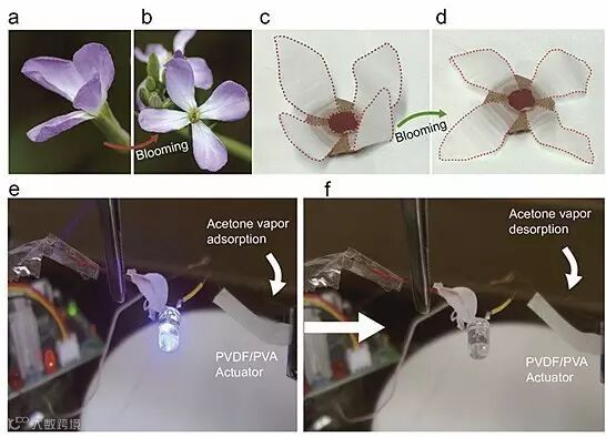 他们还将PVDF/PVA双层膜的复杂运动应用到不同的场景,如花瓣形状的双层膜吸收丙酮分子产生像萝卜花一样的形变运动。而且,他们进一步利用这种仿生运动设计了薄膜传感器,可以长时间连续监测环境中丙酮的浓度。当环境中丙酮浓度过高时,传感器自发形变接通电路,电灯发亮;当丙酮浓度逐渐降低时,传感器恢复到原来的形状并断开电路,电灯熄灭,因而可利用电灯的变化来指示环境中丙酮蒸汽浓度的高低。这一研究成果不仅提出了刺激响应性高分子可控运动的通用方法,而且赋予了智能高分子材料全新的运动特性。这种让惰性高分子“不知疲倦”地运动起来,媲美自然界中复杂的运动方式,将大大推动聚合物材料在传感器、人工肌肉、柔体机器人等领域的重要应用,相关工作发表在Advanced Materials 上。
