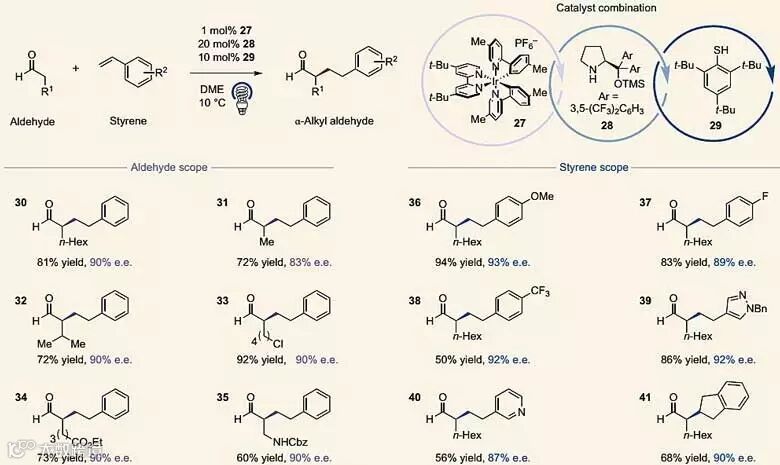 作者随后将目光转移到醛的分子间烷基化反应,使用的催化剂组合是27/28/29,并利用位阻更大的硫酚作为HAT催化剂,以此避免巯基、乙烯基之间发生副反应。从结果可以看出,醛的类型和苯乙烯类底物芳基取代基的电性对产物选择性影响较小,都能以良好的选择性(83-93%)得到目标产物30-38,但是芳基取代基的电性对产率影响较大,吸电子取代基的产物产率较低。杂环取代和二取代的乙烯基类底物也能很好地适用于该反应,以良好的结果得到产物39-41(图4)。