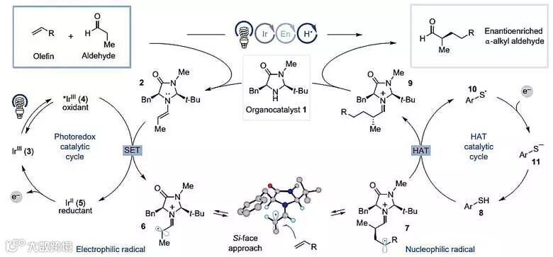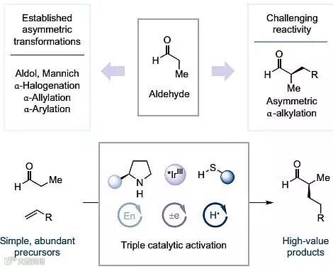 MacMillan教授团队报道了光氧化还原/烯胺/HAT催化三种催化体系协同作用的醛与简单烯烃的不对称加成反应,实现醛的直接、对映选择性α-烷基化。该催化体系不仅适用于分子内的不对称加成反应,分子间过程也同样奏效。该反应可以很方便地用简单原料制备高附加值的产品,具有很重要的研究价值和工业应用潜力。