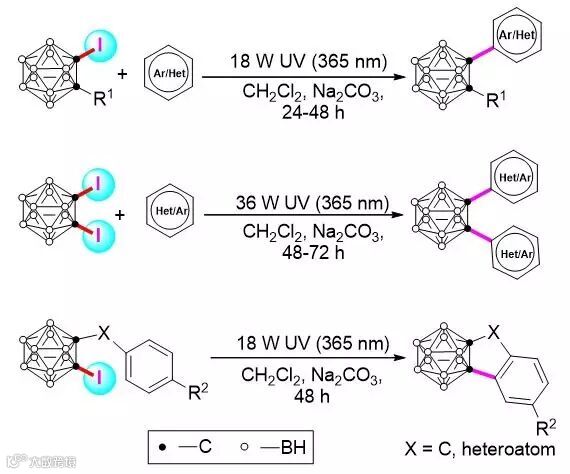 无需过渡金属及光敏剂,谢作伟课题组实现了紫外光照射下碘代碳硼烷与芳香烃或杂芳香烃的去碘偶联反应,该方法为碳硼烷碳顶点高效芳基化提供了一条新路径。