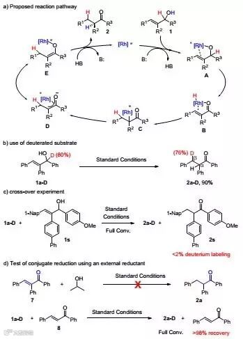 作者还提出了该反应的可能机理。首先底物烯丙醇在碱的参与下去质子与Rh金属中心形成烷氧基中间体A,随后A发生β-氢消除反应得到烯酮中间体B,该中间体发生烯酮的共轭还原得到η1-Rh络合物C,中间体C通过η3-Rh络合物D异构为关键中间体E,最终E经过质子化反应得到目标产物,催化剂再次进入新的循环。为了证明该反应机理的合理性,作者随后进行了一系列氘代实验、交叉实验以及在体系中外加还原剂的验证实验,所有实验都证明反应机理中氢归属的正确性,并且证明[Rh-H]中间体不能发生分子间的还原反应(图6)。