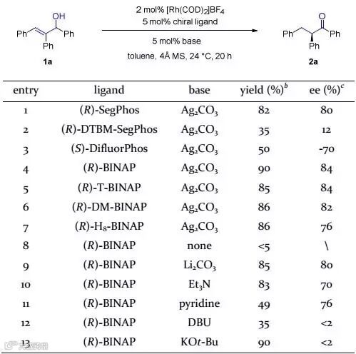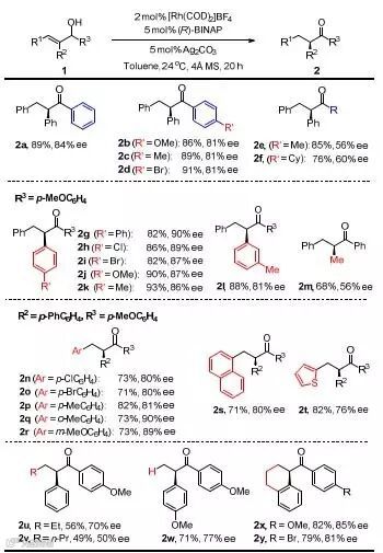 作者首先选择烯丙醇1a作为模板底物对条件进行优化。反应以[Rh(COD)2]BF4作为Rh催化剂,Ag2CO3作为碱,考察了一系列手性膦配体。权衡产率和对映选择性,使用(R)-BINAP给出最好的结果,以90%的产率和84%的对映选择性得到产物2a。作者随后考察了不同碱对反应的影响:反应在不加入碱时不能发生;使用弱碱能以中等的对映选择性得到产物2a;加入强碱虽然能顺利得到产物2a,但产物发生消旋。最终他们得到最佳的反应条件:[Rh(COD)2]BF4/(R)-BINAP作为催化剂,Ag2CO3作为碱,甲苯作为溶剂,4Å分子筛作为添加剂在室温条件下反应(图2)。