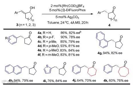 作者随后考察了一系列环状烯丙醇的异构化反应,从结果可以看出,该类底物的普适性同样较为理想,以五元至七元环状烯丙醇作为底物,反应都能以良好的产率(60-93%)和对映选择性(70-84%)得到目标产物4a-4k(图4)。