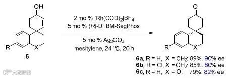 作者随后进一步扩展了底物的范围,反应能以理想的结果构建含γ手性中心的手性螺环酮,反应中以[Rh(COD)2]BF4/(R)-DTBM-SegPhos作为催化剂,Ag2CO3作为碱,均三甲苯作为溶剂于室温条件下反应(图5)。
