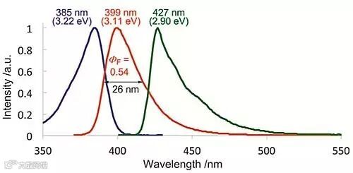 图7是三角烯2a的光谱表征数据,由于π–π*跃迁使其在λ =385 nm时UV/Vis光谱有较强的吸收带(蓝线),而荧光光谱则在λ=399 nm时表现强烈的发射,峰宽为26 nm,这是目前有机发光材料中观察到的峰宽最小值。有趣的是2a的磷光谱在λ= 427 nm(77 K)处表现出最大值。基于这两个发射最大值,估算单线态-单线态和单线态-三线态激发能分别为3.11和2.90 eV,由此可见S1和T1状态之间的差异(能量差约为0.21 eV)。这可以通过硼和氮原子之间的共振效应来解释。