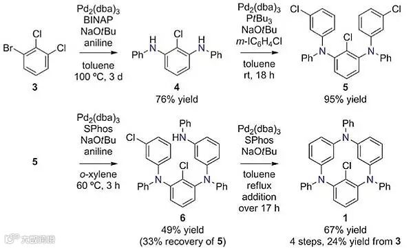 前体1的合成如图2所示,从二氯代的溴苯化合物3出发,先和苯胺发生胺基化反应得到4,接着发生氮位芳基化反应得到化合物5。控制反应条件,5发生单胺化反应得到化合物6,6在极低的浓度下(0.007 M)发生分子内环化以67%的收率得到含氮大环前体1。