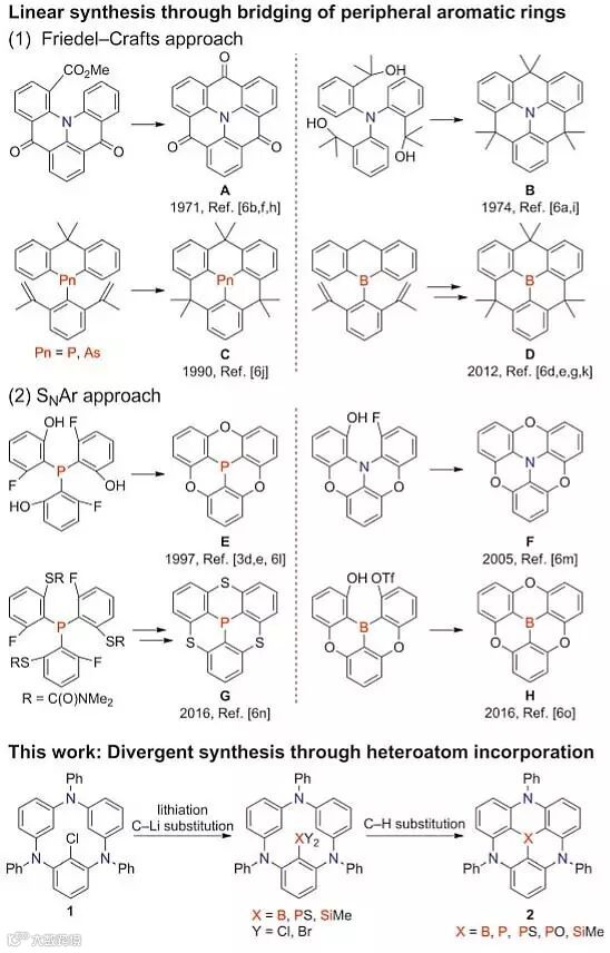 Takuji Hatakeyama课题组报道了他们在杂原子中心的4,8,12-三氮杂三角烯多样性合成方面的新进展,该过程包括对含氮大环前体的制备以及随后通过亲电的C-Li键和C-H键取代反应引入中心杂原子,合成并以X-射线单晶衍射确定了以硼、磷、硅等为中心的三角烯。作者还发现不同于以磷或硅为中心的三角烯的碗状结构,以硼为中心的三角烯具有平面结构。本文所描述的合成策略具有普适性和多样性的特点,还可用于制备一系列功能材料,比如基于三角烯的有机发光二极管等,具有潜在的应用价值。
