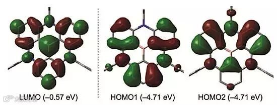 如图8所示,作者还在3LYP/631G(d)能量水平上通过理论计算的方法对三角烯2a的Kohn–Sham前线轨道进行计算并给出了可能的能量,他认为LUMO轨道定位在中心的硼原子及硼的邻、对位,而简并的HOMO轨道定位于氮原子及硼中心的间位,这样可以抑制SOMO之间的交换相互作用并最大限度地降低了S1和T1状态之间的差异。