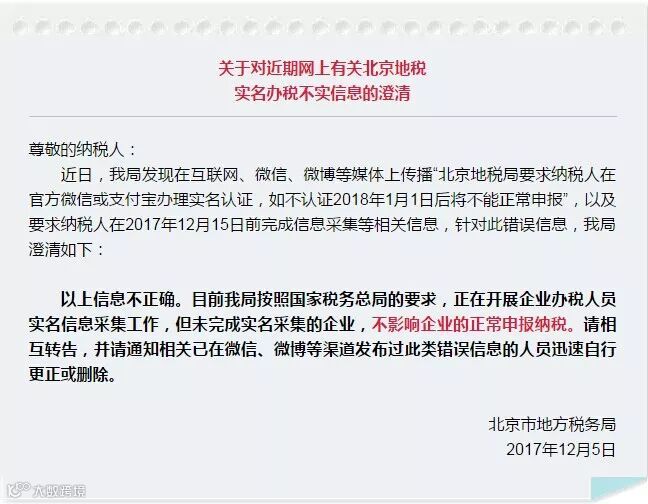近日,关于地税局要求纳税人办理实名认证的消息传遍整个互联网,最主要的是消息中写到“如不认证2018年1月1日后将不能正常申报”或是要求纳税人在2017年12月15日前完成信息采集等相关信息,而在刚刚北京地税局发布了关于北京地税实名办税不实信息的澄清,澄清如下: