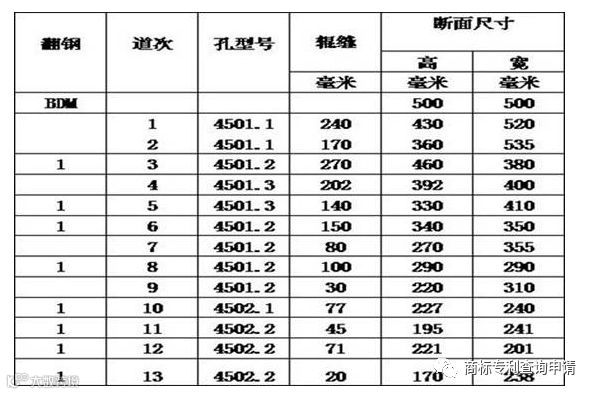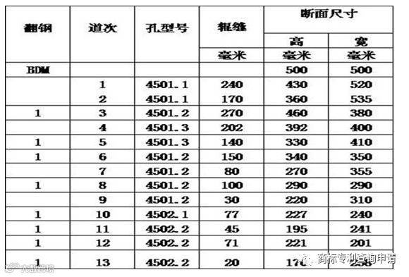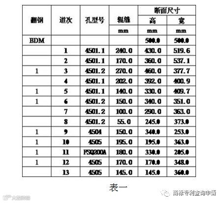 3)开坯机进行轧制:开坯机为双辊往复式开坯机,轧辊直径为Ф1200mm,大圆坯经开坯机轧制13道次后,形成该规格开坯轧制,见表4。