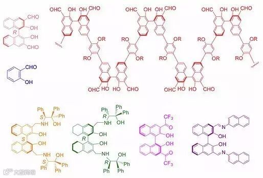 一、手性联萘酚二醛与非手性水杨醛的混合物在锌离子的存在下与手性胺类化合物(手性二胺、氨基醇、氨基酸)作用,λ1 = 447 nm的荧光增强是由于非手性探针的作用,可用于测定手性底物的浓度;λ2 > 500 nm的荧光增强是由于手性探针的作用,具有非常高的对映选择性。结合λ1 与λ2处的荧光强度,所得到的3D图谱可用于测定手性底物的对映体组成。含有联萘酚二醛结构单元的手性共轭聚合物在同样的条件下可以放大小分子的对映选择性,结合手性聚合物与水杨醛也可以实现对浓度及对映体组成的同时测定。