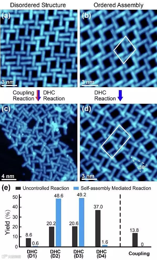 北京大学的吴凯教授课题组长期开展功能分子自组装与表面反应的研究,实现了多种新型低维纳米结构的构建和调节(Chin. Chem. Lett., 2017, 28, 525; ACS Nano, 2017, 11, 134; Nat. Chem., 2015, 7, 389; Angew. Chem. Int. Ed., 2011, 50, 7562; J. Phys. Chem. C, 2007, 111, 10138),并利用表面效应和动力学因素对分子自组装和表面反应进行了有效调控(Mater. Chem. Front., 2017, 1, 119; Chem. Comm., 2016, 52, 12944; ACS Nano, 2015, 9, 6305; J. Phys. Chem. C, 2012, 116, 21753)。最近,他们开展的一项研究表明:分子自身的自组装结构可以有效调控表面反应的产率和选择性(图1)。