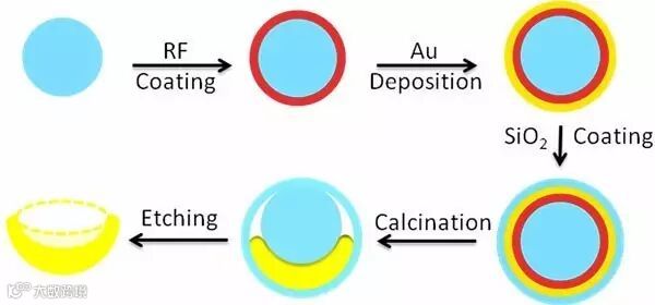 鉴于金纳米杯的重要性,材料学家发展了许多合成的方法。经典的方法包括物理法,通常是以球形纳米粒子为模板,在其表面均匀地沉积一层金,杯开口的形成则通过金的选择性沉积或壳结构的各向异性刻蚀来实现。物理法一般需在基板上进行,产率较低,极大地限制了金纳米杯等离子体性能的研究及应用。湿法化学合成可以实现大规模的合成,但以往发展的方法一般不容易产生高质量的结构。