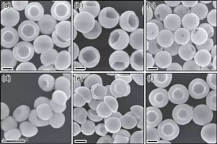 由于在合成过程中,SiO2球的尺寸及酚醛树脂层的厚度可调,因此这种方法极易得到不同高度、开口大小及直径的金纳米杯。图2的扫描电镜图像表明,由(a)至(c)酚醛树脂的厚度逐渐减小,金纳米杯的高度逐渐增大,开口逐渐减小。另外,通过改变SiO2球的大小,他们可以得到直径不同的金纳米杯。图2中(d)至(f)表明,随着SiO2球的尺寸变大,金纳米杯的直径依次增大。