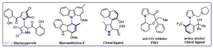 轴手性芳基吡咯普遍存在于具有重要生物活性的天然产物中,特殊的立体结构使其在各类不对称有机催化的反应中表现出良好的手性传递和诱导功能。目前关于吡咯类轴手性化合物的研究甚少,已有的报道仅是通过动力学拆分、对映选择性偶联、N-芳基化等方式来实现,通过有机分子催化对映选择性合成轴手性芳基吡咯的方法却一直未见报道。