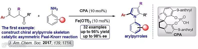 最近,南方科技大学化学系谭斌课题组利用不对称双酸催化的策略,借经典的Paal-Knorr反应,在温和的条件下,通过简单的1,4-二羰基化合物和邻位带有大位阻基团的芳香胺发生Paal-Knorr缩合,高收率、高对映选择性地合成了含芳基吡咯骨架的轴手性化合物,实现了首例不对称Paal-Knorr反应,反应规模能够扩大至克级。目前,该研究成果在化学期刊Journal of the American Chemical Society 上成功发表。