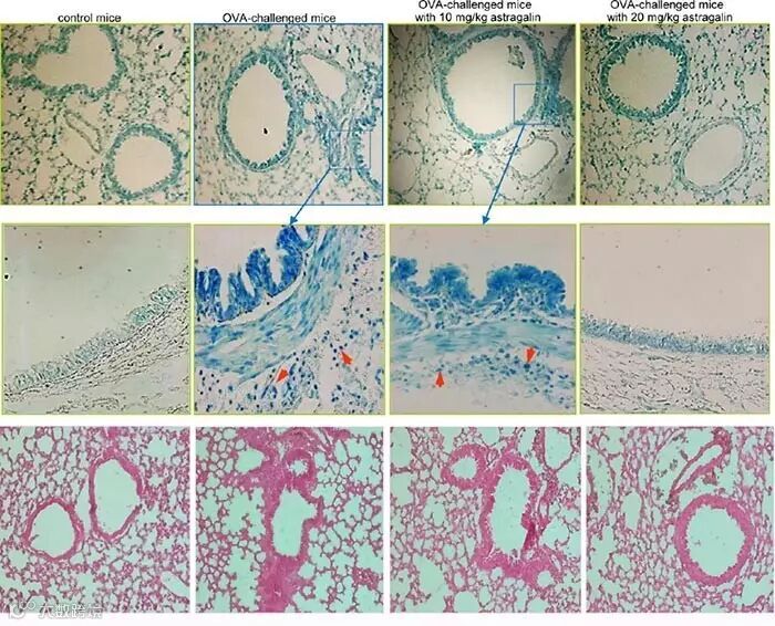 大师兄:“除了免疫组化,组织形态学观察在动物实验中也是非常重要的一种手段。比如这篇文章就观察了紫云英苷对疾病模型动物气道中肥大细胞数量(下图前两行),以及气道变厚情况的改善(下图第三行)。结果非常直观。”