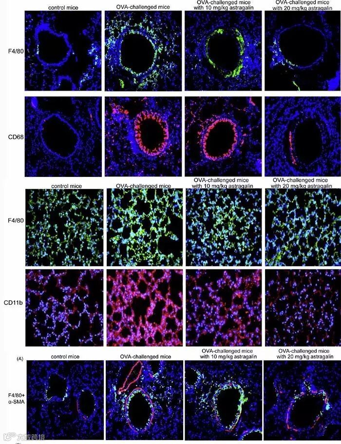 大师兄:“孺子可教!不过呢,就一个化合物对疾病的影响而言,其动物水平实验结果的重要性远高于细胞水平的研究结果。有效无效要看动物实验结果,细胞水平的研究可以锦上添花,但很难雪中送炭。你看这篇文章的工作重点也是在动物实验上。比如下面这个免疫组化结果图,绿色和红色信号分别反映了气道组织关键蛋白F4/80和CD68(或CD11b)的相对含量。说的粗俗点,有病的颜色深,无病的颜色浅。”
