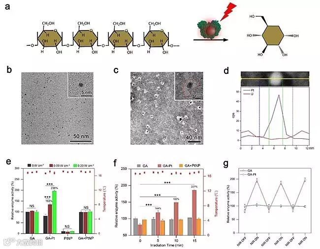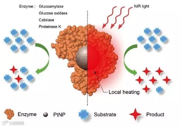 图1. 近红外光照射酶内部的铂纳米颗粒产生光热效应进而提高酶的催化活性