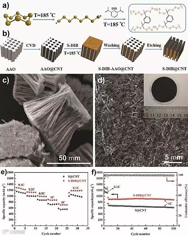 图1. 有机硫聚合物(a)和有机硫聚合物/碳纳米管复合材料(b)的合成示意图;有机硫聚合物/碳纳米管复合材料(c)和膜电极(d)的扫描电镜照片;物理和化学双重限制的有机硫聚合物/碳纳米管与单一物理限制的硫/碳纳米管复合材料的倍率性能(e)和循环性能(f)对比。