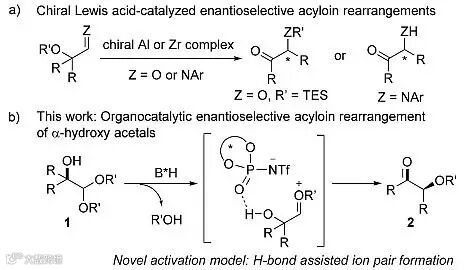Acyloin重排是α-羟基醛(酮)通过1,2-烷基(芳基)迁移转化成其异构体的反应,该反应在重排后会产生新的手性中心,然而存在可逆平衡问题使该反应的不对称合成充满挑战。到目前为止,只有Maruoka和Wulff等人报道了Lewis酸催化的不对称α-羟基醛和亚胺的Acyloin重排反应,有机分子催化的Acyloin重排反应到目前为止尚无报道。亲核试剂对羰基氧鎓离子的加成反应是最近的一个研究热点,由于缺乏Lewis酸或氢键配位的碱性位点导致羰基氧鎓离子周围形成手性环境变得很困难。随着最近手性离子对催化概念的出现和发展,该问题也得以迎刃而解。该催化体系广泛用于环状稳定的羰基氧鎓离子,如色满类化合物的催化反应,但是非环状的羰基氧鎓离子不对称反应的报道却很少。正是在这样的背景下,来自瑞士洛桑联邦理工学院(EPFL)的祝介平(Jieping Zhu)教授课题组在Angew. Chem. Int. Ed. 报道了首例有机分子催化的α-羟基缩醛的不对称Acyloin重排反应,高效合成了一系列手性非环状的α-烷氧基酮类化合物(图1)。该文第一作者为Hua Wu博士。