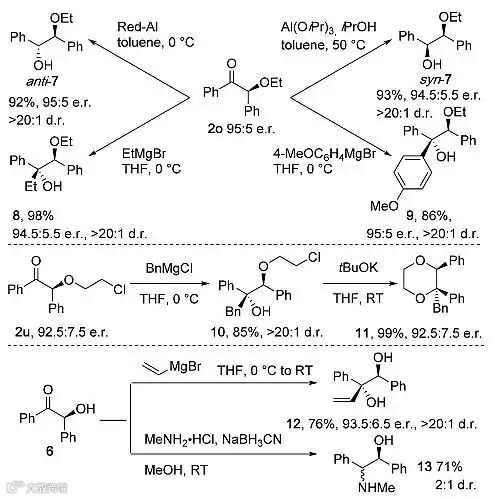 为了证明反应的实用性,作者进行了许多衍生化实验。他们首先选择产物2o作为底物,尝试了还原和格氏试剂加成实验,以高产率、高手性保持、高非对映选择性得到产物7-9。当使用2u作为底物,通过羰基1,2-加成/环化反应,以高产率、高对映选择性构建了手性1,4-二氧六环类化合物11。当使用消除保护基的6作为底物时,也可顺利地发生加成和还原胺化反应得到产物12和13(图6)。