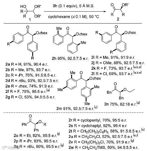 祝介平教授课题组报道了首例有机分子催化剂催化的α-羟基缩醛的不对称Acyloin重排反应,高效合成了一系列手性α-烷氧基酮类化合物,产物的羟基保护基在温和条件下很容易消除,且产物的手性可以得到很好的保持。