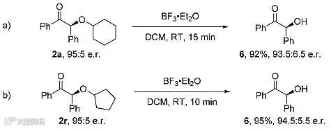 作者随后进行了脱保护基实验,从图5可以看出,使用三氟化硼可顺利消除环己基或环戊基,在消除过程中产物的手性得到了很好的保持(图5)。