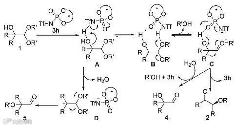作者随后还提出了该反应的可能机理。首先是催化剂3h和底物1形成氢键得到中间体A,中间体A和B之间存在如下平衡,B消除一分子醇得到羰基氧鎓离子C,进而发生1,2-碳迁移得到最终产物(图7)。