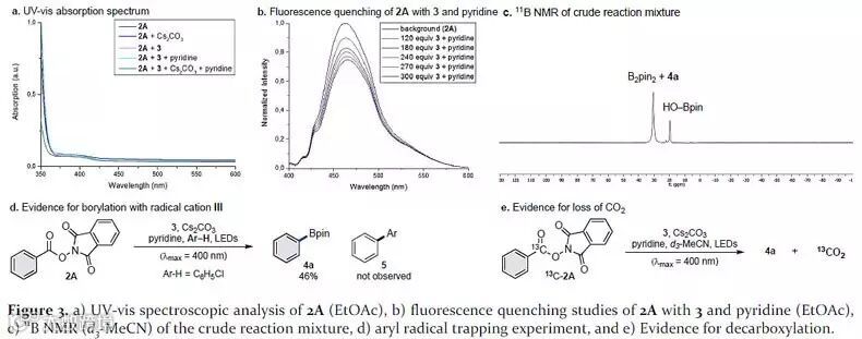 接下来,他们还对反应机理进行了研究(图4)。2A在光激发下得到激发态2A*,该物种具有很高的氧化电位(Ered = +1.6 V vs SCE),能够与吡啶复合物I发生电子转移,得到自由基阴离子II和自由基阳离子III,II发生脱羧反应得到芳基自由基,与III发生硼转移得到产物4与吡啶盐IV。紫外和荧光光谱数据也证明了激发的2A*与酯1之间有一定的作用(图5a-b)。作者还对反应体系进行核磁共振11B NMR谱跟踪,体系中出现了HO−Bpin的信号(图5c),由IV与体系中微量的水反应得到,这也证明了芳基自由基不是直接与硼酸酯3反应,而是与III或I反应得到产物;进一步的控制实验也证实了该过程(图5d)。除此之外,他们还通过13C标记实验加以佐证(图5d)。