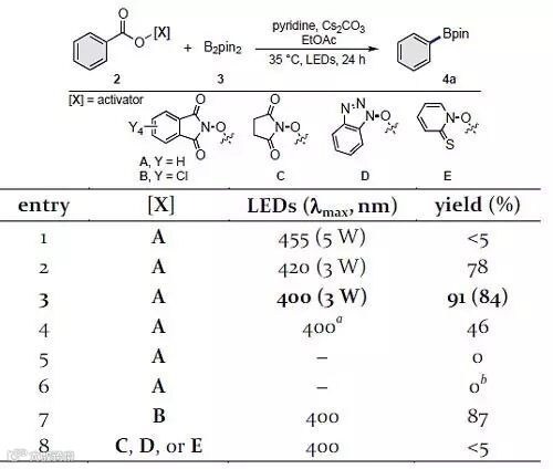 清华大学焦雷课题组最近报道了吡啶催化芳基卤代物的自由基硼化反应(J. Am. Chem. Soc., 2017, 139, 607),在此过程中硼酸酯与吡啶形成的复合物容易被氧化,因此作者设想硼酸酯3与吡啶的复合物(图1b,I)可以还原激发态的邻苯二甲酰亚胺,最终得到芳基硼酸酯,2A与硼酸酯3、吡啶在455 nm LED灯的激发下,仅能够得到<5%收率的产物4a;提高激发光的能量,最终可以91%的收率得到4a(图2, entries 1-3);在缺少Cs2CO3的情况下,反应收率降至46%,这说明Cs离子在反应中起到了稳定阴离子中间体的作用(图2, entry 4);在没有激发光的情况下,即使是加热条件下反应也无法进行(图2, entries 5-6);将NIPH替换为其他类似结构,反应效果均不理想(图2, entries 7-8)。