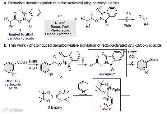 羧酸化合物广泛存在于天然产物中,是一类廉价的有机合成前体,通过脱羧偶联反应可以完成多种官能团的转化。过渡金属催化的芳香羧酸脱羧可以得到亲核性的有机金属中间体,然而这些反应往往需要较高的反应温度,并且邻位有取代基的芳香羧酸反应性很差。此外,通过Ag和过量的过硫酸盐也可以氧化芳香羧酸脱羧形成芳基自由基中间体,此类反应同样无法适用于邻位取代的芳香羧酸,并且由于苛刻的反应条件和自由基的高活性,往往只能用于脱羧羟基化和脱羧芳基化反应。最近,来自德国明斯特大学的Frank Glorius课题组报道了可见光参与催化的芳基N-羟基邻苯酰亚胺酯的脱羧硼化,反应无需过渡金属参与。