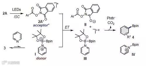 作者课题组发展了一种无需过渡金属参与、可见光诱导的催化芳基羧酸发生脱羧硼化制备芳基硼酸酯的反应,反应的关键步骤是光诱导的酯2与吡啶及硼酸酯的Lewis复合物I之间的电子转移过程。该反应条件温和、普适性好,可以应用在已商品化的药物分子合成中,具有广阔的应用前景。