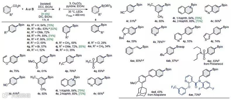 NIPH酯既可以通过DCC促进对应的羧酸通过偶联再重结晶制备,也可以在DIC(二异丙基碳二酰亚胺)存在下原位生成。在此基础之上,作者从羧酸出发一锅法得到目标产物,并且具有良好的底物普适性(图3)。芳香环对位含有给电子取代基时,具有良好的收率;含有吸电子取代基时收率略低。反应对于卤素(尤其是I)具有很好的兼容性(4a-4h);邻位具有取代基的芳香环收率明显降低(4i-4m);含有烯基醚、酯基等取代基也具有良好的收率(4n-4o)。此外,对于稠环、含N或S的芳香杂环类底物也能够得到对应的产物(4t-4u, 4w, 4y-4z)。当使用含有CF3、CN、磺酰基等强吸电子取代基的底物或者吡啶、喹啉底物时,使用更为缺电子的TCNHPI(B)作为活化剂,反应得到良好的收率(4p-4r, 4v, 4x)。将硼酸酯B2pin2换成B2neop2时,也能得到对应的Bneop化产物(2ab)。该反应也可以应用在医药或农药分子骨架的合成中(4ac-4ae)。