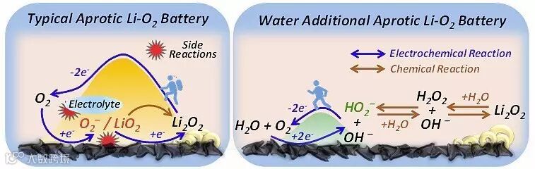 从锂-氧气电池过渡到锂-空气电池,水的引入成为不可避免的环节,因此关于水添加剂对锂-氧气电池体系的影响引起了广泛的关注。早期研究表明,水的添加促进了过氧化锂颗粒半径的增长,对应的充电分解电位也随之增长,同时不可避免地带来了更多的副反应。因此,水的存在一度被认为是不利于锂-氧气电池体系运转的因素。然而,随着一些催化剂的引入,氢氧化物取代了过氧化物成为主要的放电产物。随之而来的是超低充电电位的实现和超长循环性能的提升。可是迄今为止,关于水的存在对于锂-氧气/空气电池体系的影响仍缺乏深入的认识,针对反应的机理也未达成统一的理解和共识。