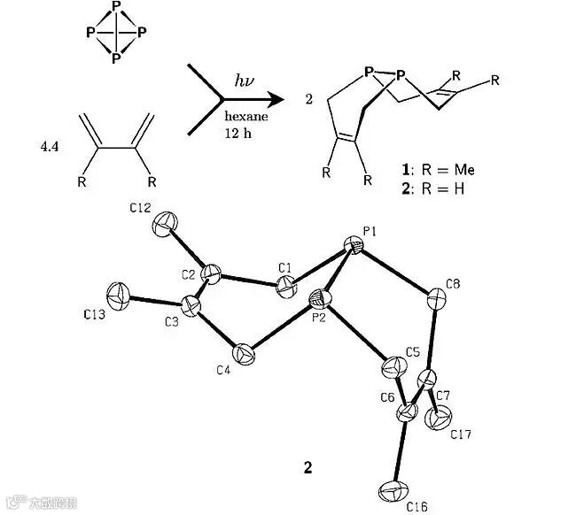 按时间顺序,首先我们介绍一下麻省理工学院(MIT)的Christopher C. Cummins教授在2010年发表的一篇VIP论文(Angew. Chem. Int. Ed., 2010, 49, 7516-7518)。这篇论文报道了在紫外光照射下,P4会降解为高反应活性的P2分子,随后P2与体系中存在的共轭二烯烃发生两次Diels-Alder环加成反应生成稳定的环状二膦分子1和2(图2)。