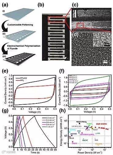 首先,他们使用可重复利用的商品化定制的导电玻璃模板,通过电化学沉积的方法制作基于聚吡咯纳米线的微型超级电容器,极大地简化了制作微型超级电容器的流程,并降低了制作成本。与此同时,聚吡咯自身优良的导电性和储能性能确保了微型超级电容器优异的储能能力(图1)。基于此设计的微型超级电容器成本可低至每平方厘米不到1元。同时,该微型超级电容器能量密度可以达到15.25 mWh/cm2。