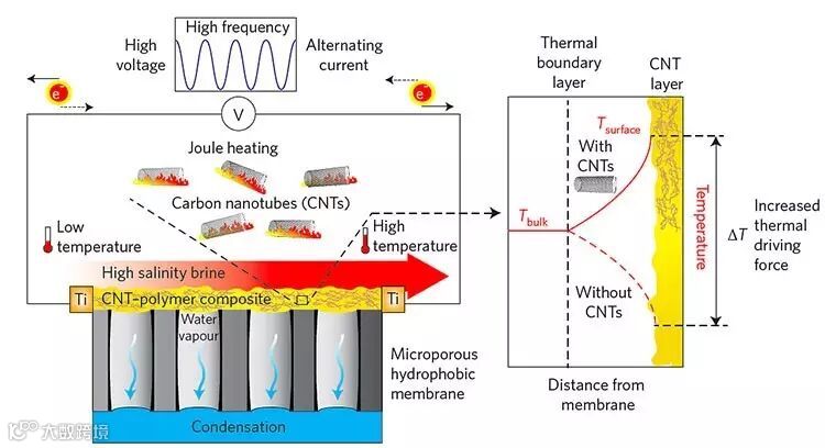 本文研究者抓住了膜蒸馏中的一个关键问题:如何保持膜两侧较高的温度差(即驱动力)?他们想到的办法是:在膜的蒸发一侧安一个加热器,而这层加热器由碳纳米管所组成。其加热原理为焦耳加热,即电流通过导体时因电阻所引起的发热现象。