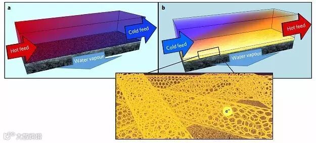 常规(a)和带碳纳米管加热器(b)的膜蒸馏过程。图片来源:Nature Nanotech.