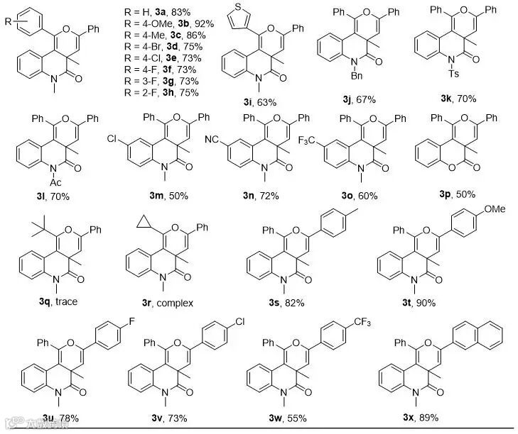 得到最优条件后,作者又对底物普适性进行了考察。他们首先固定苯甲酰氯2a,一系列的1,7-烯炔都能以较高的产率得到目标产物。分析结果发现,炔烃端位有富电子芳香环取代时产率明显高于缺电子芳香环(3a-3i)。内酰胺的氮上有不同取代基时,均能以良好的产率得到目标产物(3j-3l)。当氮原子相连的芳香环上有取代基时,反应依旧可以顺利发生(3m-3o)。将酰胺结构换成酯时,也能以较好的产率得到相应的产物,大大提高了底物的适用范围(3p)。但是,当炔烃端位有烷基取代时,反应无法进行或者得到的体系十分复杂(3q,3r)。随后作者还固定了1,7-烯炔1a,对不同取代的酰氯底物进行考察。从实验结果可以看出,富电子的芳基酰氯的反应产率普遍高于缺电子的芳基酰氯(3s-3x),这可能是因为富电子的芳香酰基不仅可以稳定反应中产生的正离子中间体,还有利于羰基氧对碳正离子的进攻。4-三氟甲基苯甲酰氯的反应活性较低,将反应延长到18小时仍然有部分1,7-烯炔未发生反应,只能以55%的产率得到目标产物。