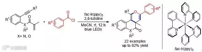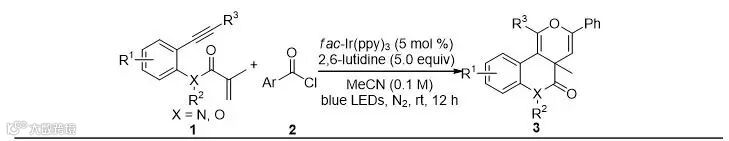 过渡金属催化的1,7-烯炔串联环化反应作为一种简单高效地构建C-C键的方法,一直是有机合成中的热门研究领域。酰基自由基是一种十分有用的自由基中间体,但由于自身的亲核性限制以及产生酰基自由基所需要的苛刻反应条件,在有机合成中的应用却远不及简单的烷基自由基甚至是烯基自由基频繁。基于以上情况,兰州大学功能有机分子化学国家重点实验室的许鹏飞教授课题组报道了可见光氧化还原催化剂作用下芳基酰氯产生芳酰基自由基,与1,7-烯炔串联环化合成稠环吡喃结构的反应。
