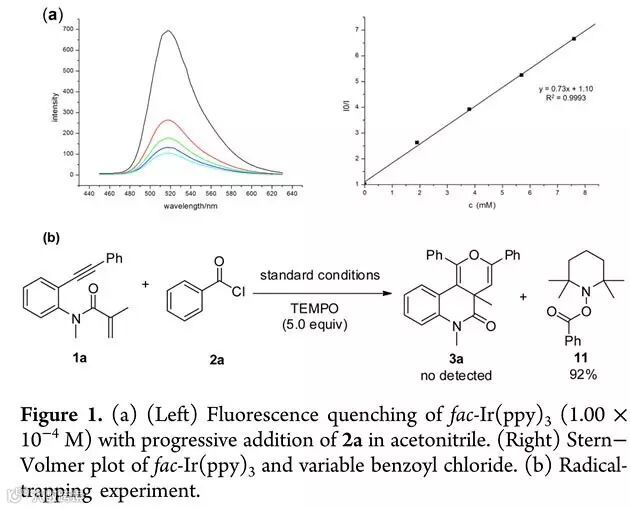 作者为了验证反应机理,设计了荧光淬灭实验,并根据Stern-Volmer方程进行了线性拟合。结果显示,只有苯甲酰氯能够淬灭fac-Ir(ppy)3,而2,6-二甲基吡啶对fac-Ir(ppy)3没有影响,这就证明了反应确实是从苯甲酰氯开始启动的。同时,作者还向反应体系中加入了常用的自由基捕获剂四甲基哌啶氧化物(TEMPO),体系中的酰氯随之消失,但是并没有得到稠环吡喃化合物3a,只得到大量苯甲酰基取代的TEMPO化合物11,从侧面证实了反应中确实有苯甲酰基自由基产生。