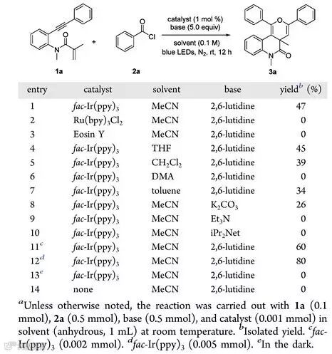 作者选择1,7-烯炔1a和苯甲酰氯2a作为底物进行条件筛选,当加入光催化剂fac-Ir(ppy)3和2,6-二甲基吡啶时,串联环化反应得以发生,以47%的产率得到预期产物3a (entry 1)。通过对反应条件的进一步优化,他们最终得到的最佳反应条件是:1,7-烯炔1a (0.1 mmol),苯甲酰氯2a (0.5 mmol)和光催化剂fac-Ir(ppy)3 (0.005 mmol)加入1 mL的乙腈体系,室温条件下氮气保护,以5 W蓝色LED灯照射12个小时,最终分离得到目标产物。同时,他们通过对照实验证明了光氧化还原催化剂以及可见光对反应发生的必要性。